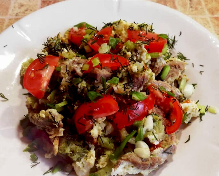 К этой "запеканке" добавила свежих помидорок черри и зелень.