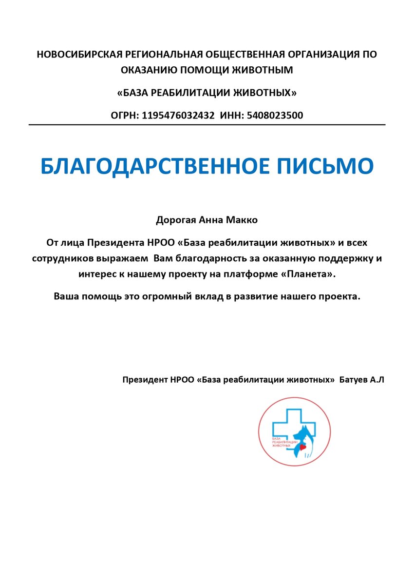 В адрес Её величества королевы Анны Макко поступило благодарственное письмо от НРОО «База реабилитации животных» из Новосибирской области. Данная организация занимается оказанием квалифицированной ветеринарной помощи бездомным животным.