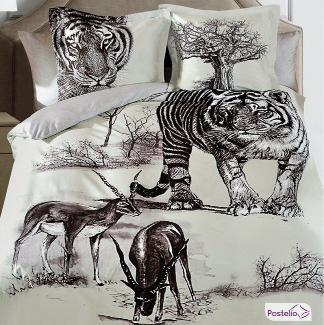 Однотонные постельные комплекты смотрятся стильно. Постель в мелкий рисунок, клетку, полоску тоже имеет своих поклонников и помогает создавать стиль. Но не менее интересны и крупные принты с изображением животных.