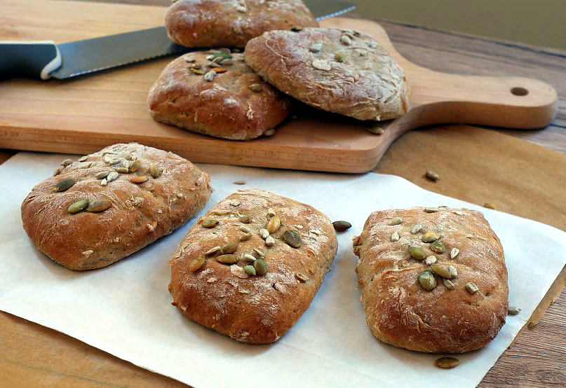 Булочки из пшеничной и ржаной муки. Посыпанные зернами подсолнечника и семечками тыквы. Рецепт рассчитан на 6 среднего размера булочек. Это самые вкусные булочки, которые мне удалось испечь.
