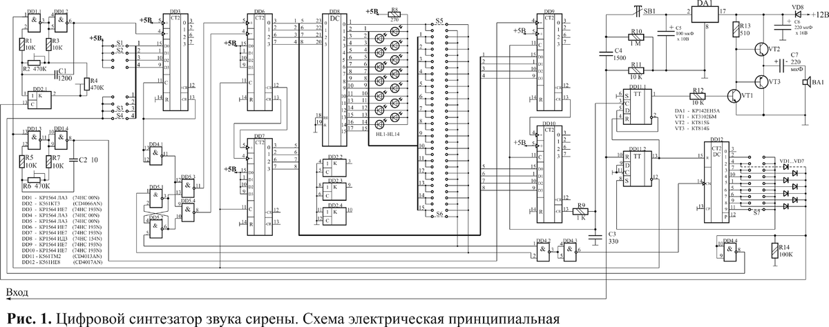 В устройстве применены ИМС серий К561, КР1564, резисторы постоянные — МЛТ-0,125, подстроечные — СП3-38б, конденсаторы — неполярные типа К10-17, электролитические — типа К50-35, светодиоды HL 1… HL 14 — типа АЛ307АМ, БМ, интегральный стабилизатор DA 1 — типа КР142ЕН5А, кнопка типа КМ1-1. ИМС серии КР1564 (74 HCxxN ) заменимы на соответствующие аналоги серии КР1554 (74 ACxxN ). Налаживание устройства заключается в установке желаемой частоты тональности сирены с помощью резистора R 6 и перемычек S 5, S 6, а также периода повторения с помощью резисторов R 2, R 4 и перемычек S 1… S 4. Устройство, собранное из исправных деталей и без ошибок работает сразу при включении.
