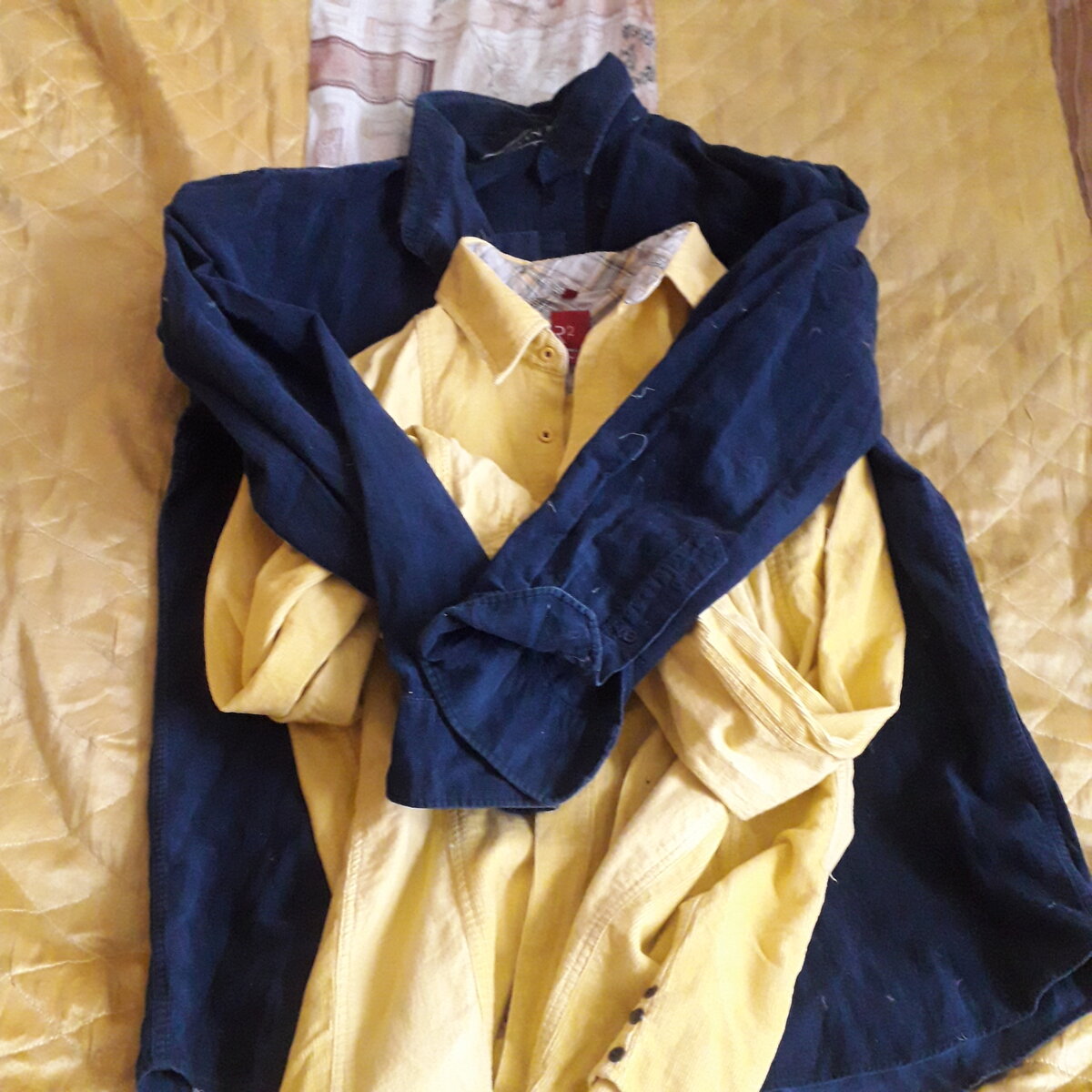 Это вельвет. Лет им 16. Да, да и такое храню)). Рубашки хорошие, зачем их выбрасывать ? Сразу решила, что буду шить теплый халат. Только вот как ? Рубашки сына, он еще школьником был. Размер, наверное 40- 42. А у меня 54. Как раскроить ? Что бы и уместиться и при этом симпатично выглядеть.