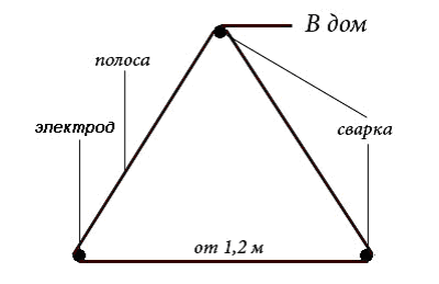 Длина каждого электрода должна быть не менее 2 м, в качестве материала можно использовать обычный стальной уголок 50 на 50 мм, водопроводную стальную трубу – главное, чтобы площадь сечения была не менее 150 мм2, а толщина стенок – не менее 3,5 мм (если выбираете трубу – минимум 32 мм). Минимальное расстояние между электродами – 1,2 м.