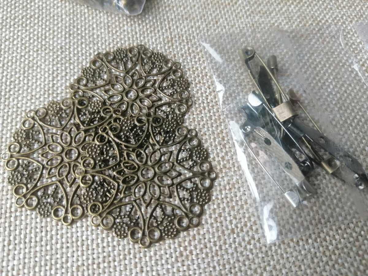 Привет всем! Такую брошку давно хотелось попробовать сделать, да все откладывала, хотя и были заготовлены все материалы. Нужна основа для плетения, ажурный круг, к которому крепятся бусины и застежка. Проволока для бижутерии. Различные декоративные детали: листочки, шишечки, желуди. Они металлические. Все эти материалы заказывала на алиэкспресс. Бусины и бисер. Из полимерной глины сделала розочки и бутоны. Можно купить готовые из пластика, так же на алиэкспресс есть большой выбор. Для крепления в них сделано отверстие. Если нужно подробное описание как сделать розочки, пишите, сделаю по ним мк. И конечно, для работы нужны кусачки и круглогубцы. Когда все материалы подготовлены, начинается самое интересное и сложное - собрать все это разнообразие в одну целую композицию. Все бусины, листочки и розы закрепляем на проволоку. Для этого отрезаем проволоку длиной примерно 10 см, продеваем через бусину два раза и скручиваем. Бисер собираем в веточки, также продевая проволоку два раза