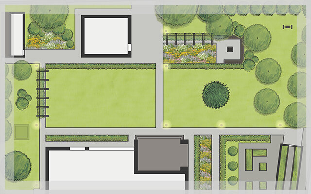Все линии на плане прямолинейные, так как подчиняются общей концепции участка и стилю главного строения – дома в стиле хай-тек.