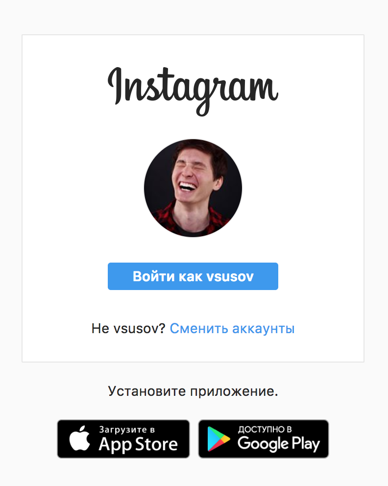 В-третьих, если Вы привязывали к аккаунту свой фейсбук, можно войти через него. Сделать это можно как через мобильное приложение, так и с веб версии. Для этого достаточно залогиниться в приложении фейсбука на телефоне или на сайте с компьютера, а потом открыть приложение или сайт инстаграма соответственно. Если ваша фб страница была привязана к Вашему инстаграм профилю, то Вы сможете войти по одному клику: