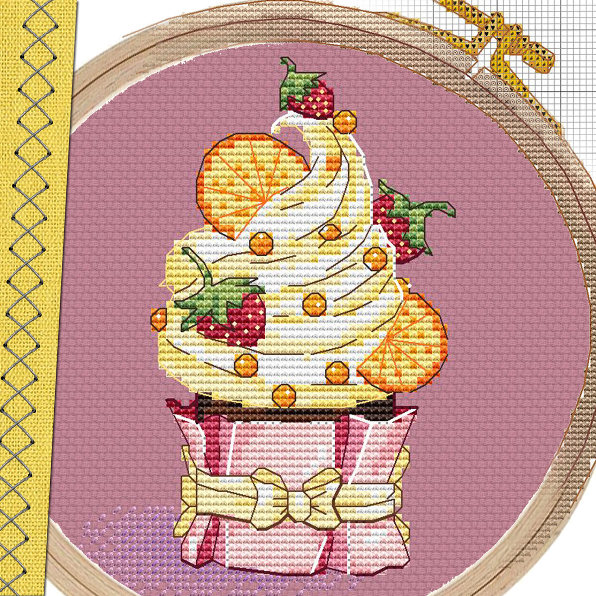 Апельсиново-клубничное! Очень интересный сюжет! апельсины навеивают новогоднее настроение, клубничка - летнее. И все это вместе, так же прекрасно подойдет к Пасхальному декору! Можно вышивать на любой тканной основе, на пластике и на одежде! Ну кому не захочется майку с такой аппетитной пироженкой?