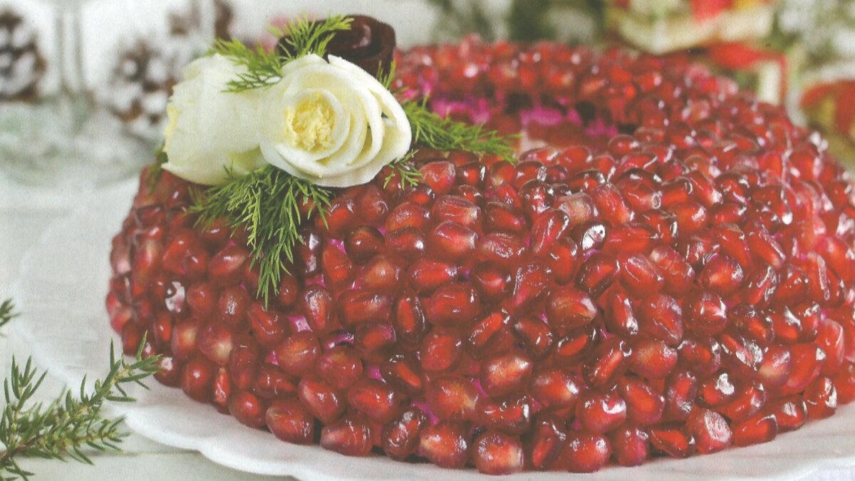 Из граната вынуть зерна. На середину блюда поставить стакан и вокруг него выкладывать слои салата. Сначала распределить половину курицы, посолить, поперчить, выложить тонкий слой майонеза. Затем морковь, сверху картофель (посолить, поперчить), покрыть майонезом. Половину свеклы и посыпать грецкими орехами, слой лука и слой оставшейся курицы (посолить, поперчить), покрыть тонким слоем майонеза. Затем слой яиц (посолить, поперчить) и майонеза распределить сверху и по бокам «кольца». Вынуть стакан. Оставшуюся свеклу смешать с майонезом и обмазать этой массой весь салат. Всю поверхность «браслета» равномерно покрыть зернами граната.