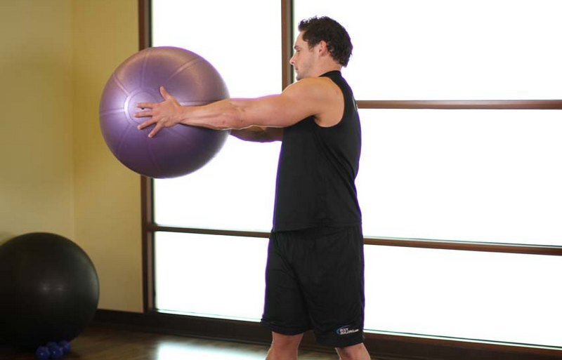 Возьмите мяч в руки, встаньте прямо, ноги примерно на ширине плеч. Держа мяч, вытяните руки перед собой и начинайте поворачивать корпус, в левую и соответственно правую сторону. Ноги во время выполнения упражнения должны оставаться в неподвижном состоянии. Выполните в каждую сторону 4 подхода, по 15-20 повторений.