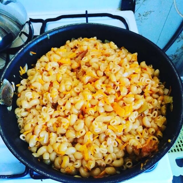 Сначала на сковороде делаю пережарку из лука и моркови. Потом добавляю макароны к пережарку и перемешиваю. Заливаю все кипятком. 5 минут держу под крышкой и з минуты без крышки. Соль, перец не забываю. Сегодня добавила ещё томатный соус. По желанию масло.