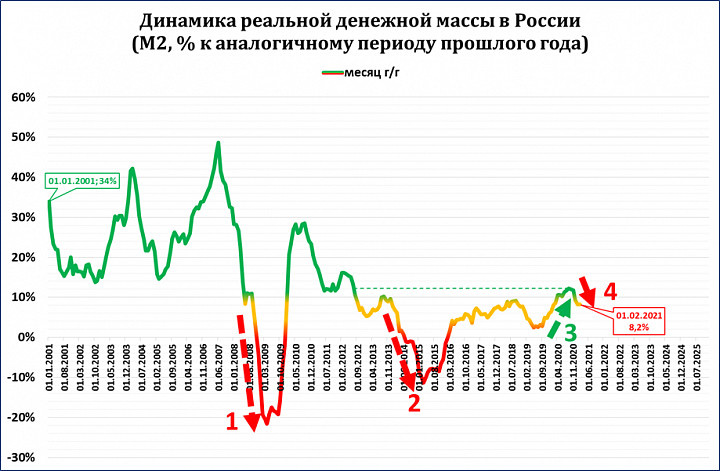 Оба этих фактора (меньше прирост денег, выше рост цен) привели к тому, что в реальном выражении (то есть, «за вычетом инфляции») прирост денежной массы снизился с 12,2% в сентябре 2020 - до 8,2% на 1 февраля года текущего.