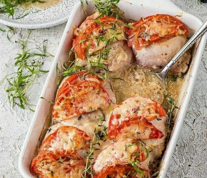 2) Курицу нафаршировать грибами, свернуть рулетики и уложить в форму. Полить сливками, положить ломтики томатов, посыпать тёртым сыром.