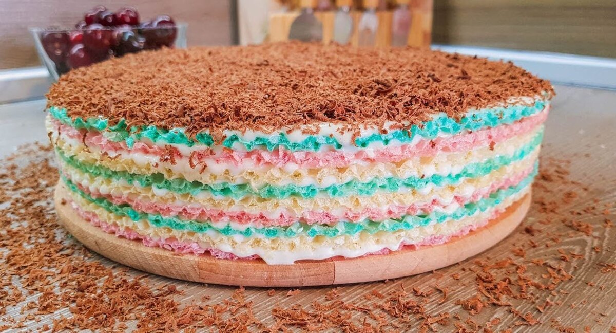 Этот вкусный и оригинальный торт вы приготовите , не включая духовку . Несколько незамысловатых манипуляций , и обычные покупные вафли превращаются в праздничный десерт . Рецепт для тех , кому неохота возиться с выпечкой !