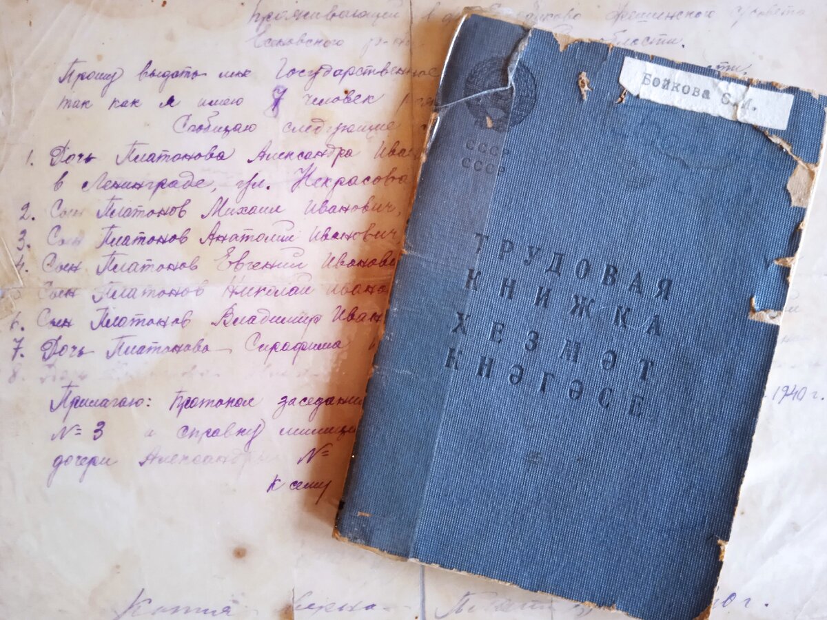 Слова "Трудовая книжка" продублированы по-татарски, от того, что официальную трудовую деятельность бабушка начала в городе Казани, куда уехала 14-летней девчонкой из родной деревни Стройково к брату Михаилу.