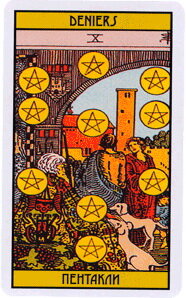 Полное описание колоды на сайте: На аркане старец. Он богат, успешен. Это видно по всему, что его окружает. Он сидит и отдыхает. Рядом семья, взрослые дети, внуки. Но они как бы живут своей жизнью. И герой не требует их внимания. Он гладит породистых псов. И просто радуется за свою семью. Они все как бы в уютном пространстве дома и двора, но через арку виден город. Пентакли повсюду. Пройдя весь путь Пентаклей герой достигает вершин мастерства, а с этим и вершин благополучия. Он давно насладился сам и уже разделил все с близкими. Не так, как делил на Шестерке. С тех пор он сильно поумнел. Да и тот опыт учел. Теперь он уже в годах, его путь пройден. Он отдыхает. Он сделал то, для чего приходил в этот мир. Свои умения он передал ученикам. Есть чувство завершенности. Ему на самом деле не нужно ежесекундное внимание близких. Ему достаточно издалека наблюдать за их ростом. Он самодостаточен. Ему есть о чем подумать, с кем поговорить, чем заняться. Он прожил насыщенную жизнь и впору учиться