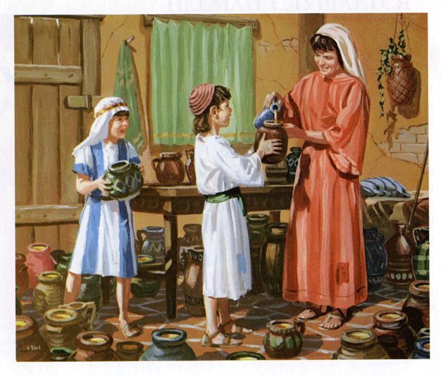 Женщина берёт свою бутылочку с маслом. Какая она маленькая и незначительная по сравнению с огромным множеством сосудов вокруг! Затаив дыхание, она наклоняет зажатый в руке флакон над ближайшим кувшином. Масло потекло… оно течёт… и течёт. Глаза её раскрываются всё шире и шире. Масло течёт до тех пор, пока сосуд не наполняется до краёв. Она говорит сыновьям: «Скорей, принесите мне другой кувшин!» Масло продолжает течь, пока не наполняет и этот сосуд, и мальчики бегут за третьим, чтобы подать его матери. Когда все сосуды наполнились из, казалось, неиссякаемого источника (ст. 5), в этот дом, который познал столько горя, вернулось счастье. Смех матери смешался со звонким смехом мальчиков. Тревога исчезла с её лица, с души свалился камень. Наконец женщина сказала одному из сыновей: «Подай мне ещё сосуд» . Он же ответил: «Нет более сосудов» (ст. 6). Все собранные у соседей кувшины были полны. И тогда «остановилось масло» (ст. 6): оно перестало течь из бутылочки; она была пуста; чудо закончилось. Вот теперь она, наверное, поняла смысл наставления «набери немало» . Количество масла было ограничено количеством собранных сосудов.