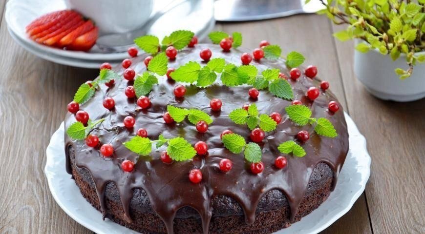 6. Для глазури в сотейнике смешать 60 г сахара, 40 мл воды, 20 г какао, поставить на огонь, довести до однородной массы, убрать с огня и добавить шоколад, не содержащий молока. Залить верх пирога глазурью. Дать постоять несколько часов.