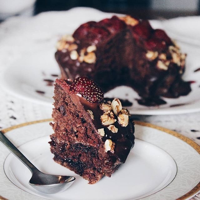 3. Готовый пирог полностью остудить. Разрезать корж на 3 части и прослоить ягодным вареньем и растопленным горьким шоколадом без примесей (можно приготовить крем, добавить ягоды, фрукты, орехи).