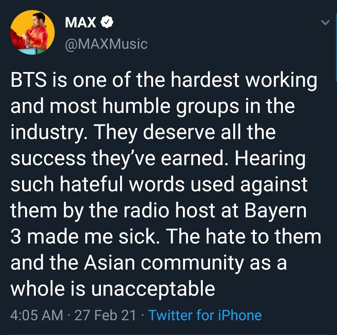 MAX в Твиттере: BTS — одни из самых трудолюбивых и скромных групп в истории. Они заслуживают всего успеха, который они получают. Меня тошнит от того, как радиоведущий Bayern 3 использовал такие полные ненависти слова в их адрес. Ненависть к ним и азиатскому сообществу в целом неприемлемы