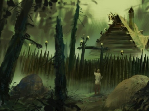 Не понял Иван, на кой ему такой спутник, но послушался – вытащил одну палку из земли. Поворачивается, а старуха наполовину из домика выползла, а ногами все в ящике прячется. Взяла она палку, к себе притянула, и как плюнет черепу в глазницу, а слюна видать серная была, потому как череп вспыхнул, из всех отверстий огонь изрыгается. Вручила Ивану старуха этот факел, да и скрылась тотчас. Дверь захлопнулась, и сразу изба как-то потускнела, еще мертвее стала, чем прежде. Развернулся Иван, крестьянский сын, сжал одной рукой палку с черепом, другой – топорик верный, и пошел по тропе между деревьев мертвых покореженных.