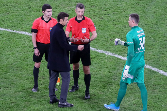 - "Не знаю, мне не было видно. Я зарекся комментировать судейства. Но мне скинули пункт правил игры и там черным по белому написано, что после вынесения желтой или красной карточки должен прозвучать свисток. Судья только выносил желтую карточку, " Зенит " быстро разыграл и забил гол. Налицо нарушение правил игру. Судьи сказали, что правила изменились. Во сколько они изменились? В 16:30?"