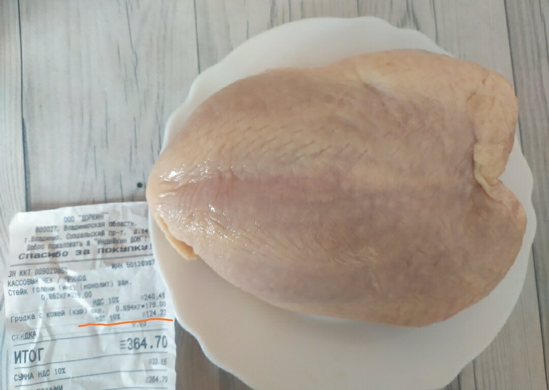 Итак, снова была куплена куриная грудка. Ее вес - 694 грамма, цена - 124 рубля, что видно по чеку.