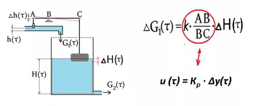 У нас есть клапан А, рычаг В и шток С, прикрепленный к поплавку. Как только поплавок начинает подниматься , он тут же через крепление В начинает прикрывать клапан А. Если вода уходит из емкости, поплавок опускается, и через рычаг В поднимает клапан А. Менять коэффициент регулирования можно с помощью приближения или удаления В от А. Менять уставку можно, удлиняя или укорачивая шток С. Это пример для наглядности. Для математического описания используем немного другую схему.