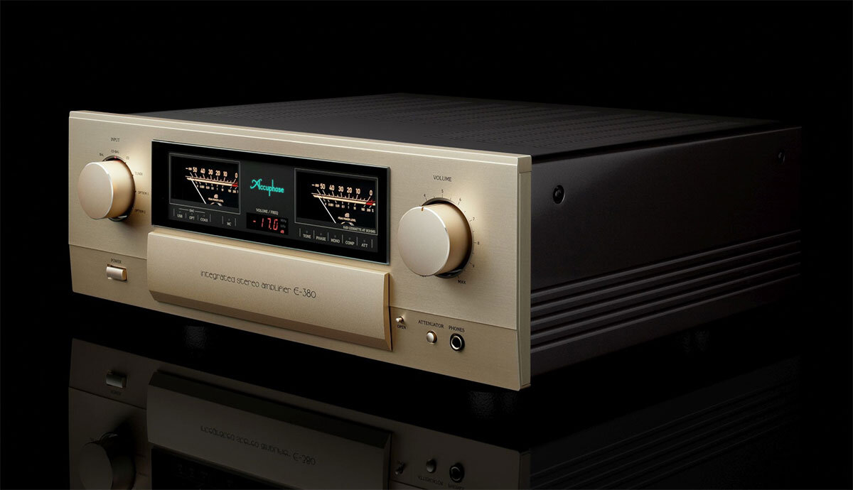 Интегральный усилитель Accuphase E -380 выглядит сногсшибательно, да и оснащение у него под стать – золотая фронтальная панель с откидывающейся крышкой, качественный ММ/МС фонокоректор, надежно экранированный массивный трансформатор в блоке питания, выходной каскад на MOSFET транзисторах. Большие стрелочные индикаторы с золотыми символами дополнены цифровым дисплеем, также показывающим уровень выходного сигнала. Мощность аппарата - 120 Ватт на канал в диапазоне 20 – 20 000 Гц, весит усилитель 22,8 килограмма.