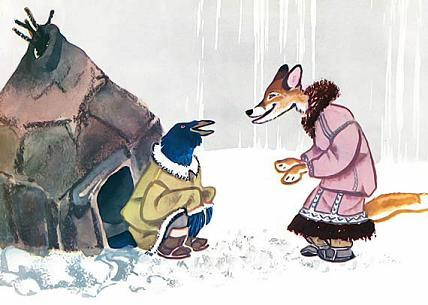В одной яранге жили-были ворон и лиса. Ворон жадный был. Однажды решила лиса рыбы наловить. Но у неё не получилось. Решила тогда лиса еду в другом месте поискать. Пошла лиса по течению реки. А ворон подсмотрел, куда лиса пошла. Увидела лиса ярангу. Там жила сова. Пригласила она лису в гости. Сняла лиса верхнюю одежду. Села на оленью шкуру. Потом выглянула в сени – а сова там её шапку меряет. А когда лиса снова выглянула, то увидела, что сова держит огромное блюдо с рыбой. - Как у тебя много рыбы! – говорит лиса. - Я тебе дам с собой, - отвечает сова. Наелась лиса, вышла в сени и надела верхнюю одежду. Хозяюшка тем временем принесла из кладовой большую охапку рыбы. Сложила лиса рыбу в свой мешок и пошла домой. Вернулась с едой, а ворон уже тут как тут. Как только лиса зашла в ярангу, ворон пошёл по течению реки и увидел ярангу. Смотрит, а около яранги прогуливается сова. Пригласила сова ворона в гости. Зашёл ворон в ярангу, снял верхнюю одежду. Через некоторое время выглянул ворон, увид