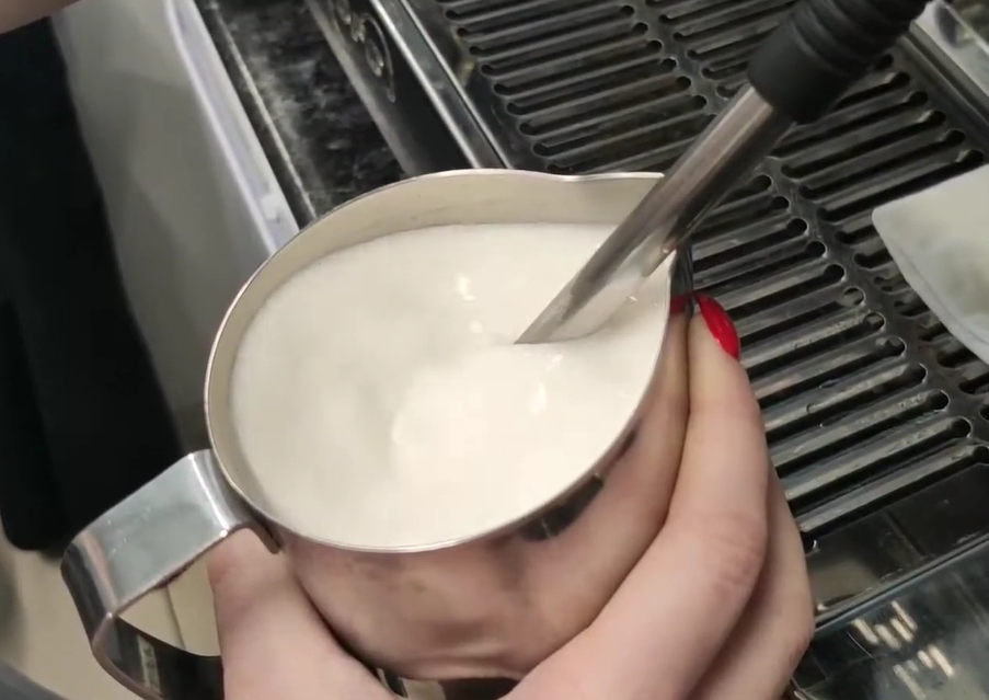 После взбивания молоко нужно продолжать вращать в питчере в том же направлении, в котором происходило взбивание. Также нужно отбить все пузырьки воздуха до полностью глянцевого состояния.