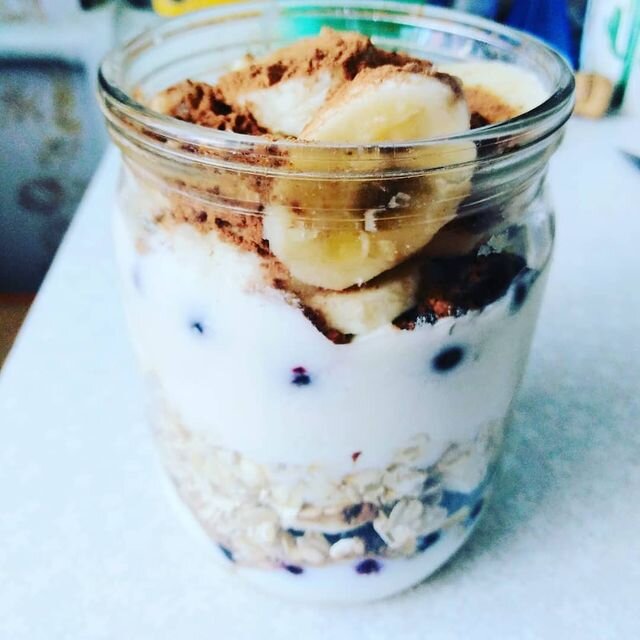 В банку укладываем слоями овсянку, классический йогурт, ягоды(у меня замороженная смородина), бананы, какао. Я сделала 2 слоя. На ночь убрала в холодильник. Можно кушать холодной или подогреть.