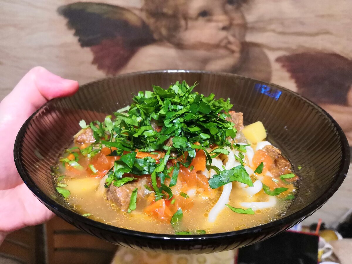 9. Отвариваем лапшу для лагмана, в кипящей подсоленной воде 7-12 минут, затем промываем в холодной воде и заправляем маслом.