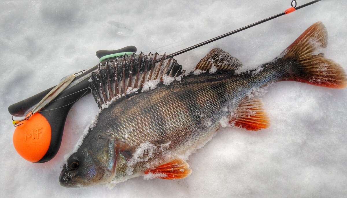 Вполне взрослый окунек. Ну, думаю, случайность. Не должен он крупные блесны кушать сейчас. Перехожу на маленькую и снова пусто. Да не может быть. Опять ставлю крупную. И каждая лунка даёт по 1-3 штучки разнокалиберного окуня.