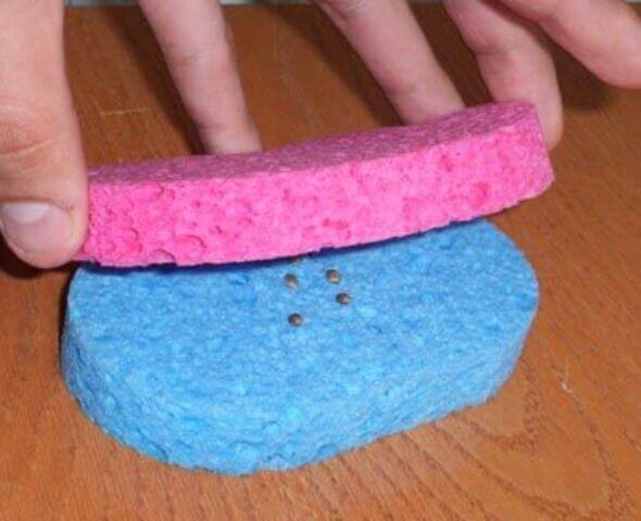 Берем 2 ватных диска, или 2 маленьких губки для мытья посуды, или кусок туалетной бумаги, сложенной несколько раз, смачиваем их и слегка отжимаем, чтобы они были мокрые. Между дисками раскладываем в один слой семена баклажанов, диски кладем в блюдечко или пиалу, а блюдечко ставим в пакет. Можно и без блюдечка, но так удобнее.