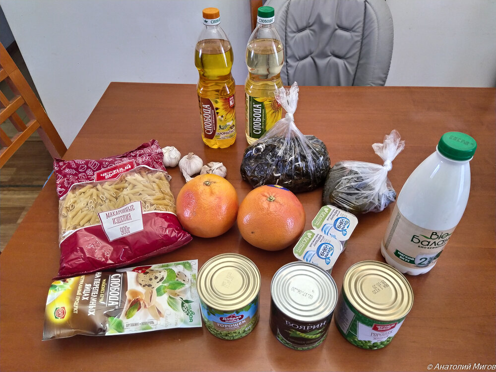 Вчера закупался на рынке, а сегодня сходил в магазин. Жена решила приготовить винегрет, отправила меня за зеленым горошком, солеными огурцами и подсолнечным маслом. Вдобавок я еще купил 3 головки чеснока, майонез, два грейпфрута, кефир, макароны, салат из морской капусты и два детских био-творожка.