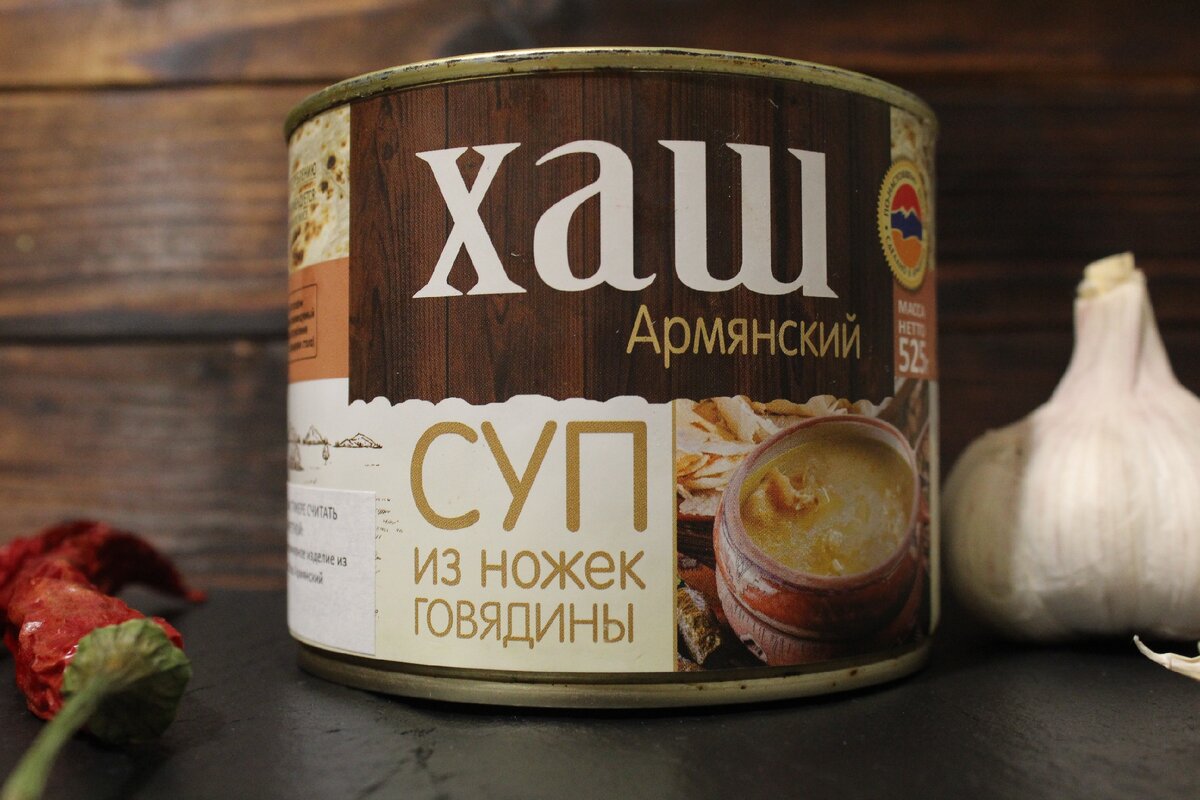 При этом у хаша достаточно большая энергетическая ценность - в 100 граммах продукта 300 кКал. А во всей банке находится аж 1580 кКал. Изготовитель: ООО "Сам-Ар". Страна производства Армения. Перед употреблением рекомендуется консервы разогреть и добавить соль с чесноком по вкусу. На первый взгляд содержимое банки, хранившейся в холодильнике, выглядит не очень - серое, полупрозрачное желе с белыми х