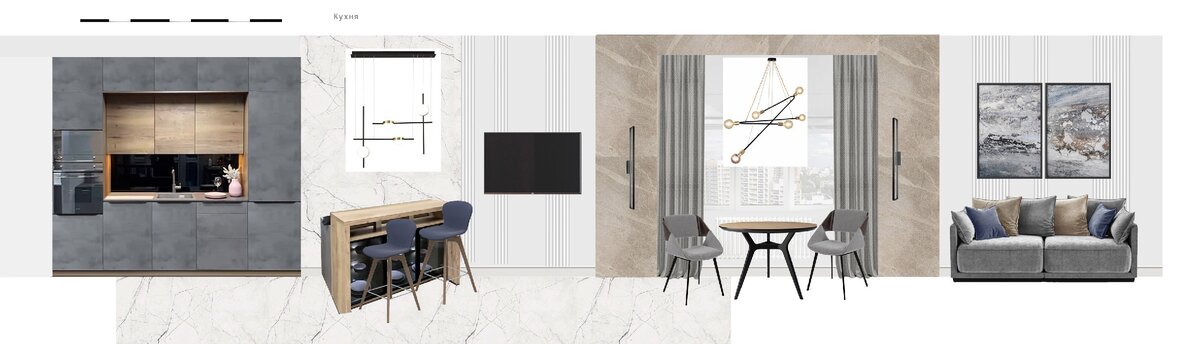 В техзадании, заказчики выбрали много референсов в стиле ар-деко. Но из-за кухни с бетонными фасадами выбрали современный стиль.