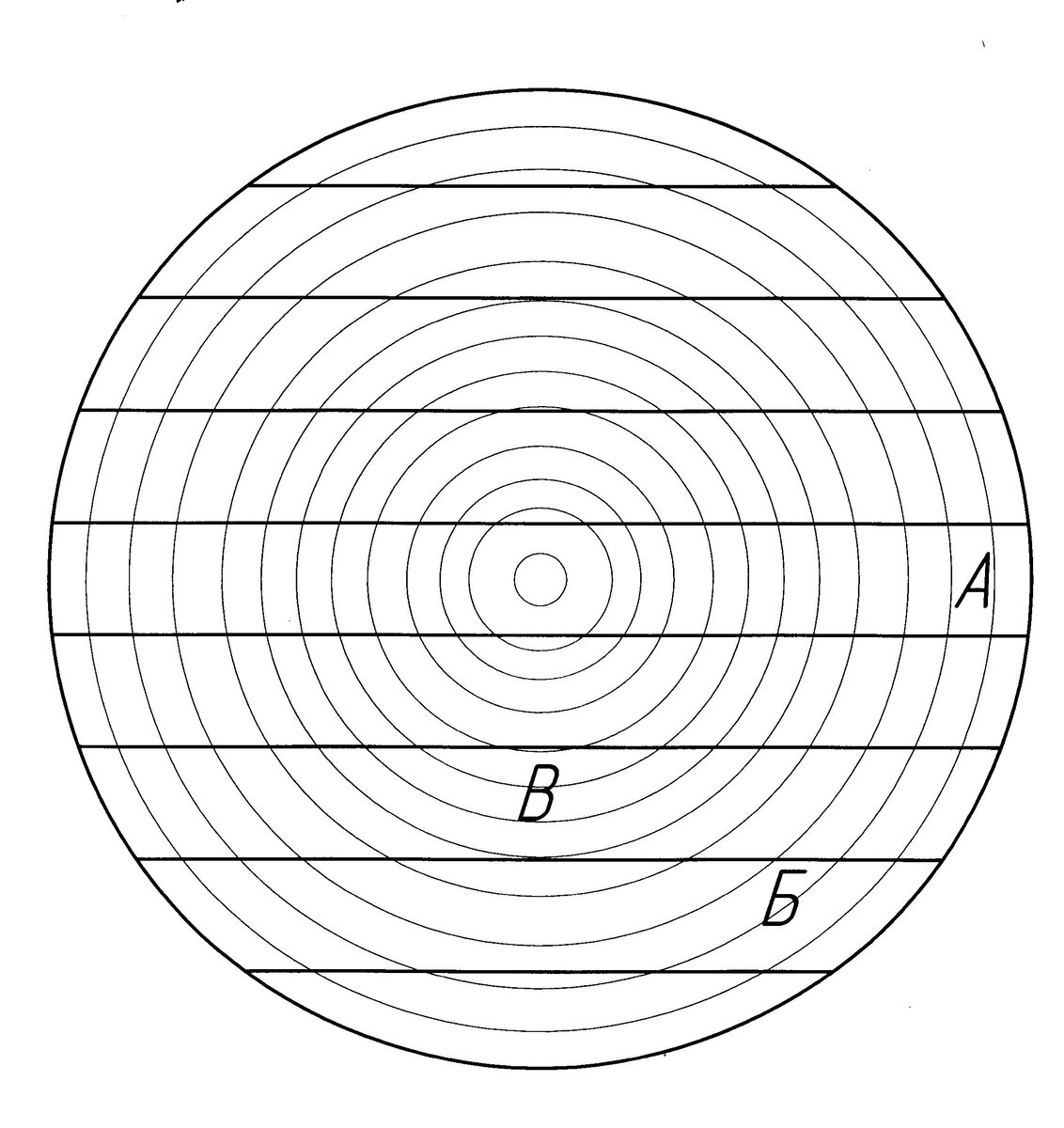 Эта технология обладает ещё одним недостатком по сравнению с ниже изложенными. В частности суть этого недостатка такова: при изготовлении берётся имеющаяся (покупная) доска, в которой существует произвольное расположение годовых колец. Понятно, что при вырезании ложки резчик планирует расположение ручек вдоль волокон древесины, а расположение относительно годовых колец задать практически невозможно, так как доски вырезаются из всего массива ствола и, как правило, направление распиловки не является строго одним и тем же. То есть одна доска в одном месте может иметь радиальное направление распила, а другие (в другой части) – разной степени тангенциальное (см. рисунок ниже). Понятно, что изделия, вырезанные из различных областей (А, Б или В), будут иметь различное расположение годовых колец в изделии, а это может (и будет!) в той или иной мере сказываться на сроке службы ложки. Об этом будет сказано ниже.