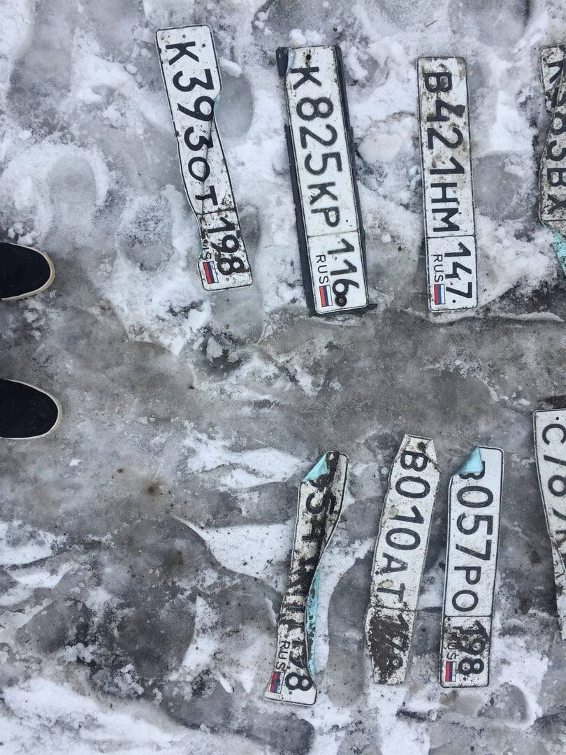 27 потерянных номеров было найдено в луже под мостом глупости. Похоже на какое-то кладбище номерных знаков ☠️