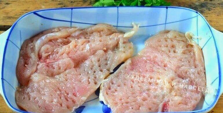 КУРИНУЮ ГРУДКУ ПРОМЫТЬ ВОДОЙ И ОБСУШИТЬ . РАЗРЕЗАТЬ ГРУДКУ ВДОЛЬ И СЛЕГКА ОТБИТЬ КАЖДЫЙ ЛОМТИК С ОБЕИХ СТОРОН. ЛОМТИКИ НЕ ДОЛЖНЫ БЫТЬ СЛИШКОМ ТОНКИЕ! (ПРИМЕРНО 1 СМ. В ТОЛЩИНУ) ВЫЛОЖИТЬ ФИЛЕ В ФОРМУ ДЛЯ ЗАПЕКАНИЯ.