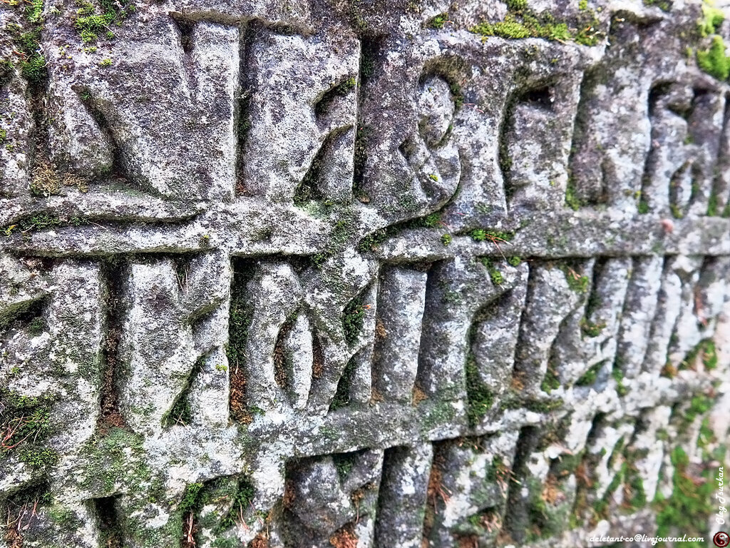 такие памятники устанавливали как правило на могилах священнослужителей. Надпись на памятнике читается очень плохо, но часть все еще можно разобрать. Первые две строки в очень плохом состоянии, основная часть читается так: