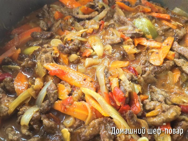 Я обычно люблю , чтобы овощи были слегка сыроваты внутри . Так вот к нашим тушеным овощам добавляем обжаренную печень и перемешиваем , солим и перчим по вкусу , если чувствуете , что не хватает соуса , добавьте немного водички или бульона ( если он есть ).