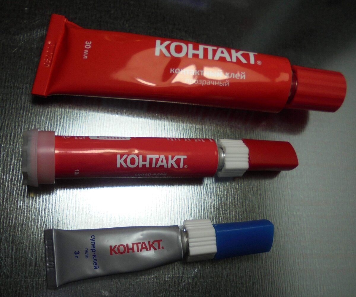 - Два других клея «КОНТАКТ» — универсальный профессиональный супер-клей в небольшом тюбике красного цвета, а также универсальный гелевый супер-клей в маленьком серо-серебристом тюбике, действуют на других принципах.