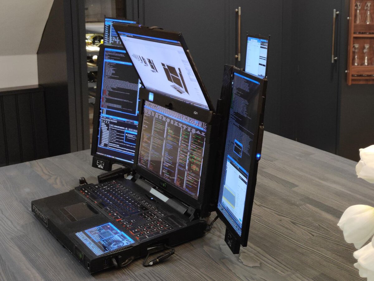 🤔 Что случилось: появился прототип ноутбука, в котором семь дисплеев. В комплект входит четыре 4К-экрана с диагональю 17,3 дюйма и три Full HD экрана с диагональю 3 дюйма. Один из маленьких экранов находится возле тачпада под клавиатурой.