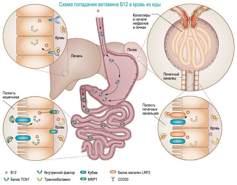 В пище витамин В12 соединен с определенным белком, который под влиянием желудочного сока и пепсина растворяется в желудке человека. Когда B12 освобождается, к нему присоединяется связующий белок и защищает его, пока он транспортируется в тонкую кишку. Как только витамин оказывается в кишечнике, вещество, которое называют «внутренним фактором В12», отделяет витамин от белка. Это позволяет витамину В12 попасть в кровь и выполнять свои функции. Для того, чтобы В12 был правильно поглощен организмом, желудок, тонкая кишка и поджелудочная железа должны быть здоровыми. Кроме того, в желудочно-кишечном тракте должно вырабатываться достаточное количество внутреннего фактора. Употребление большого количества алкоголя также может повлиять на абсорбцию витамина В12, так как уменьшается выработка желудочной кислоты.