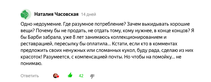 — Если у кого-то возникнет желание избавиться от своих залежавшихся, старых, сломанных кукол формата Барби, я буду рада их принять и сделать из них красоток. Взамен готова отблагодарить советскими открытками, календариками, магнитиками, киндерами, украшениями - возможно, вы тоже что-то коллекционируете. Мне можно писать на почту mistress90@rambler.ru, также моя страница в ВК https://vk.com/natyclock