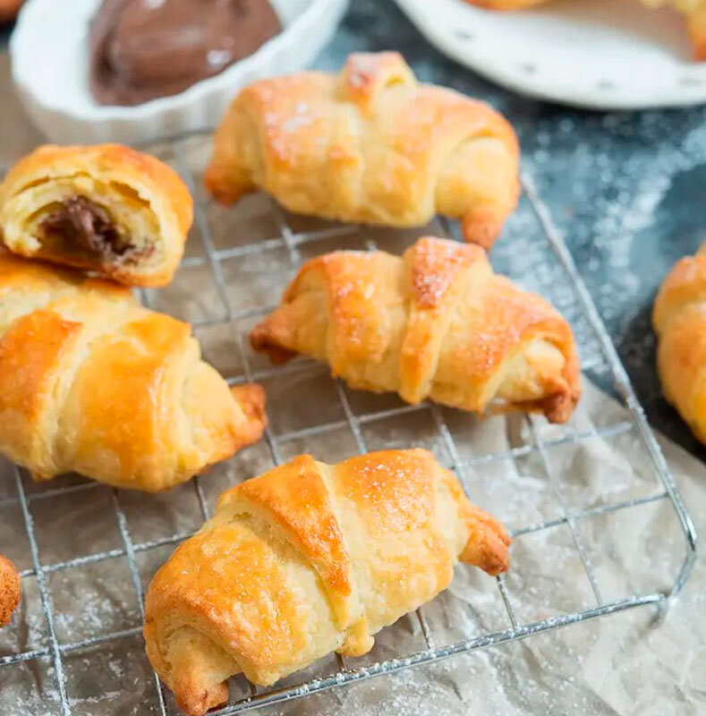 Тесто раскатываю в форме круга (слегка припыляю столешницу мукой) и вырезаю треугольники. На основание каждого треугольника кладу чайную ложку начинки, например, нутелла или мармелад (не предлагаю добавлять варенье, так как он может быстро вытечь из теста).