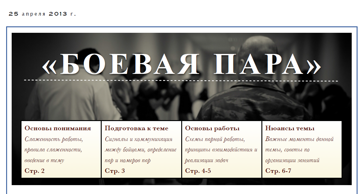Спустя много лет, помимо тренировок силовиков от МВД до ФСИН, а также людей специальных, которым важна коллективная работа, я адаптировал тему, под гражданские условия и частично ввел её в «Концепцию личной безопасности» в разделе безопасность спутника.