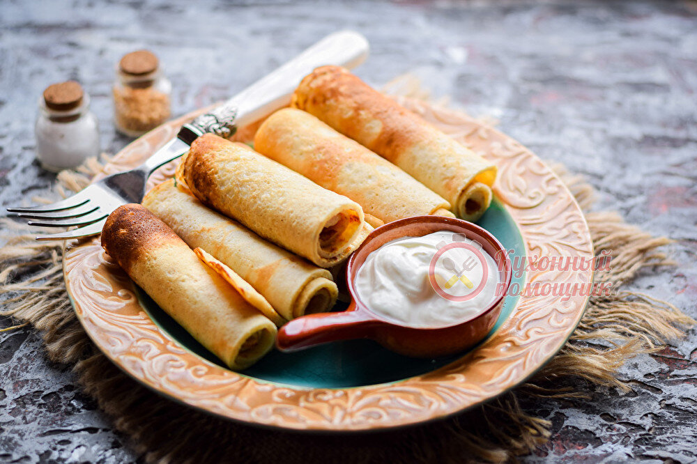 Можно кушать их просто так или со сметаной. Мне нравится заворачивать в блины разные начинки — сливочный сыр, бекон, ветчину, ломтик красной рыбы или обжаренные грибы. Если хотите сделать десерт, то заверните в блинчик творог и банан, изюм или любые другие фрукты и ягоды.