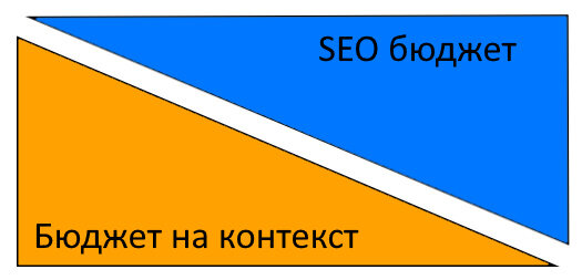 При такой стратегии бюджет должен быть разделен по диагонали: начинаем с небольшого бюджета на SEO, постепенно его увеличивая, и бОльшего бюджета на контекстную рекламы, снижая его, по мере поступления заявок с поиска.